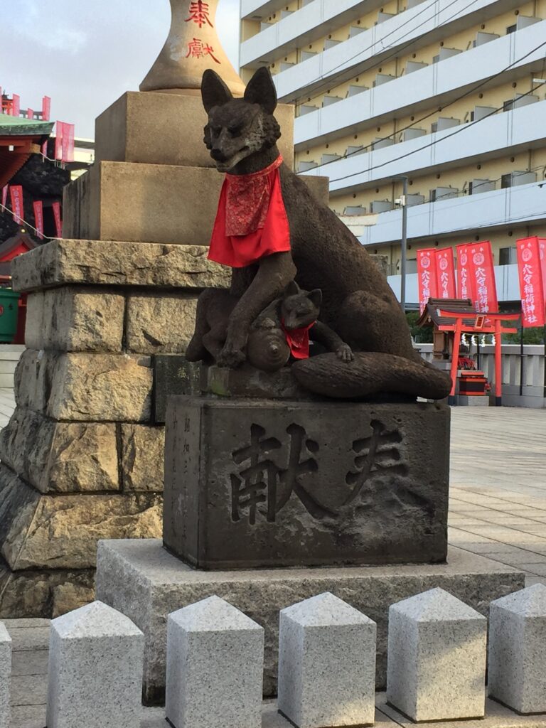 色々確認しつつ正面へ向かうと運命の出会い——稲荷の使い、狐像。