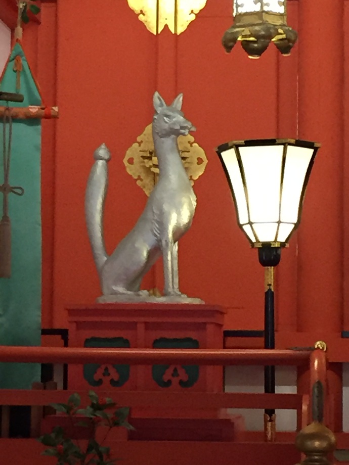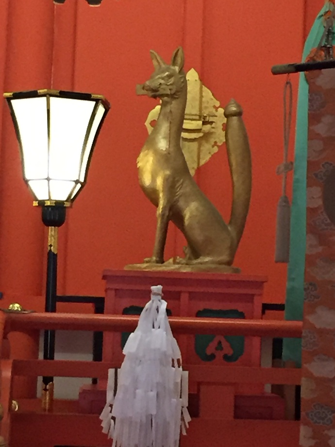 金と銀の豪華な狐像。咥えているのは鍵と巻物かな?