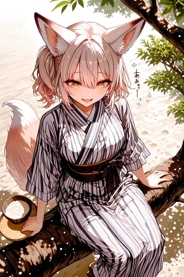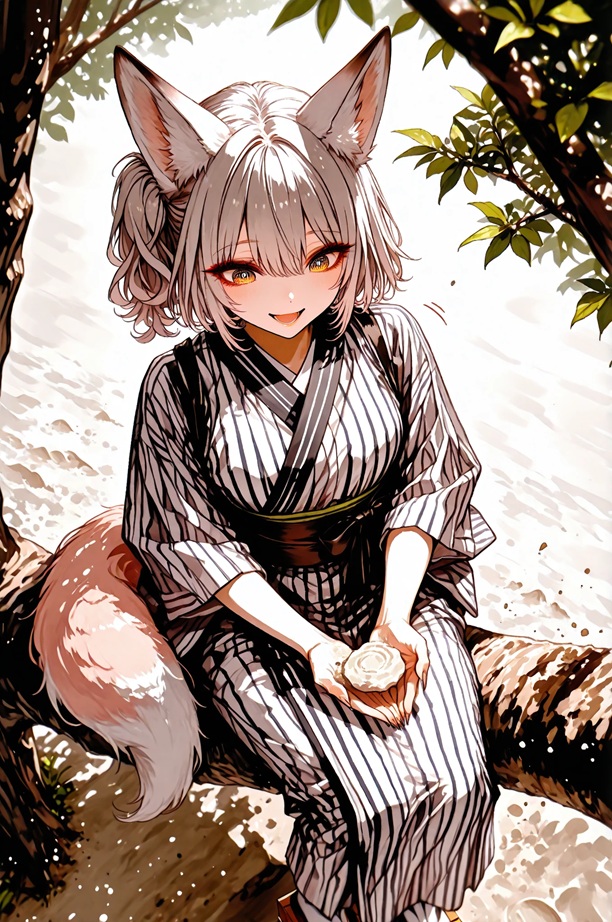 化ける時は婆の姿になり川の中で機を織り、狐の姿では老木の上から道行く人に砂をまく……うん、イラストの状態は嘘です。若い頃はこうかなと想像して作ったにすぎません。