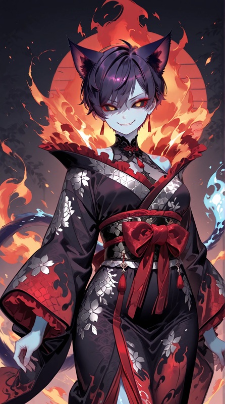 猫の妖怪というとまずは赤猫のイメージが自分の中にありまして、尚且つ火車も赤くはないのですが炎を纏っていて赤い要素があるので、髪とアイラインを赤くしました。
